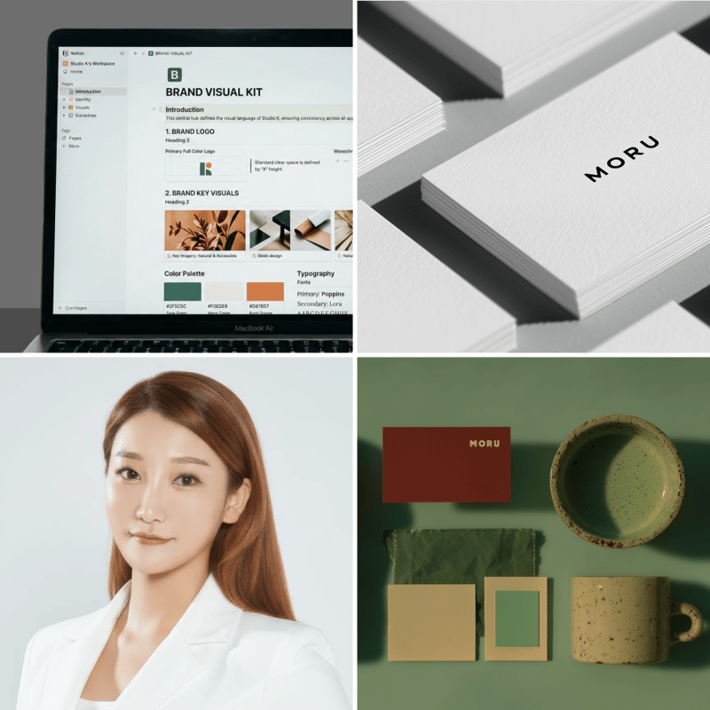 느낌을 언어화하는 기획 단계부터 시작해, 로고·페르소나·굿즈·목업 등 실제 비즈니스에 활용할 수 있는 '비주얼 키트 1세트'를 완성해서 가져가게 됩니다.